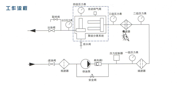 未及時沉降下來的水繼續(xù)隨油液前行,在通過分離元件時,由于分離元件表層噴涂有高分子材料,對水有強大的排斥作用,因此可把水攔于分離元件之外,使之不能通過分離元件,水自然沉降到蓄水池內(nèi),從分離元件流出的油就是凈油,這就完成了對油凈化的全過程。蓄水池內(nèi)的水通過自動排水裝置排出。
